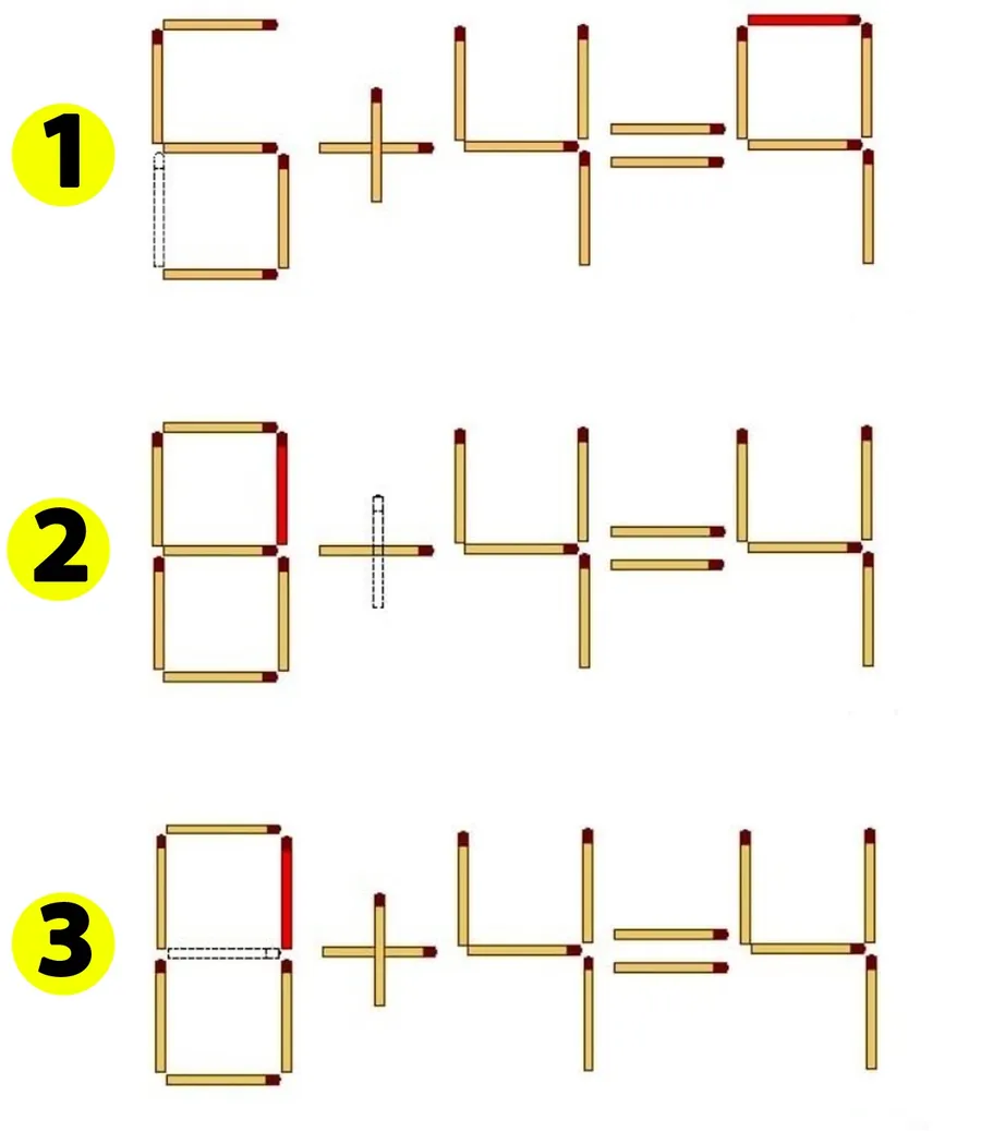 Testul de astăzi pare la prima vedere simplu, o operație matematică de clasele primare. Însă, nu este chiar așa. Ce trebuie să faci este să muți un singur băț de chibrit, pentru a corecta egalitatea 6+4=4. Atenție, există trei variante diferit de răspuns.