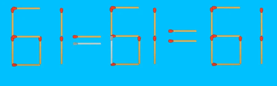 Rezolvare: Sperăm că testul este deja rezolvat, atunci când o să citești aceste rânduri. Însă, dacă nu ai făcut-o, nu este nicio problemă pentru că mai jos îți lăsăm răspunsul corect. Cum poți să schimbi ”61=61=61” în ”81-51=67”, doar mutând 2 chibrituri? Privește!