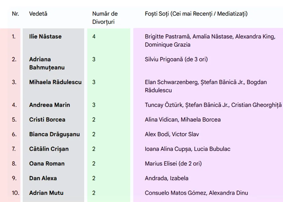 Dintre personalitățile care au marcat showbizul autohton, există câteva nume care s-au remarcat nu doar prin carieră, ci și prin palmaresul impresionant de separări matrimoniale. În vârful clasamentului se află Ilie Năstase, figura emblematică a tenisului românesc, care de-a lungul vieții a trecut prin patru divorțuri.