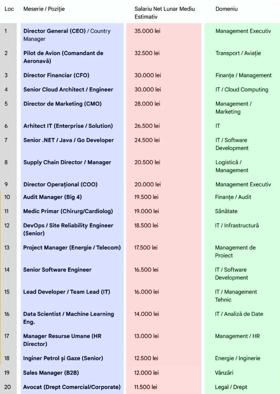 Conform clasamentului, managementul executiv și IT-ul domină topul, urmate de aviație, sănătate și energie. Salariile de peste 30.000 lei lunar sunt rezervate pozițiilor de vârf, dar și specialiștii din tehnologie sau medicină pot atinge praguri impresionante.