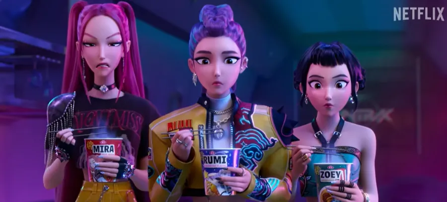 „K-Pop Demon Hunters” urmărește trei vedete K-pop, Rumi (Arden Cho), Mira (May Hong) și Zoey (Ji-young Yoo), care protejează lumea de forțele supranaturale malefice/ sursă foto: captură video