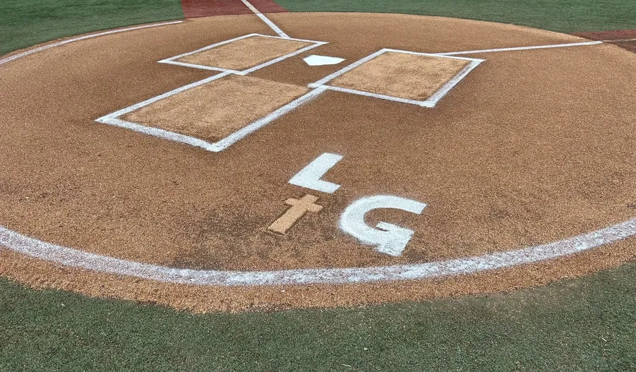 „LG” și un contur al unei cruci pe terenul de joc de la stadionul Ripken din Aberdeen. Foto: X / Michael Marcantoni