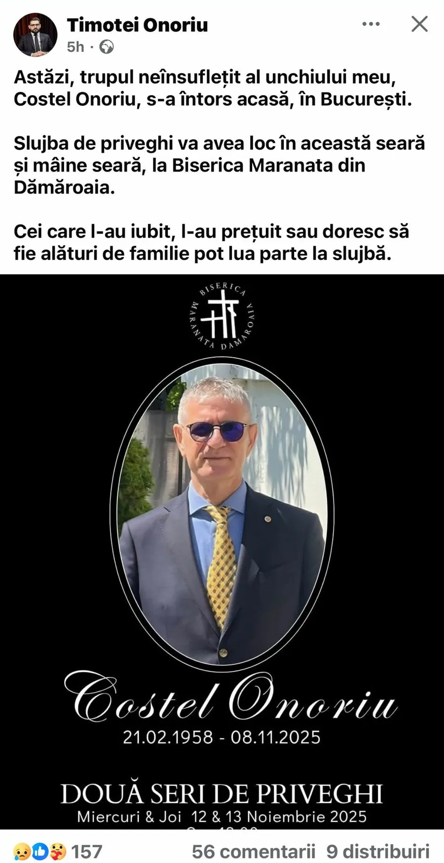 „Astăzi, trupul neînsufleţit al unchiului meu, Costel Onoriu, s-a întors acasă, în București. Slujba de priveghi va avea loc în această seară şi mâine seară, la Biserica Maranata din Dămăroaia. Cei care l-au iubit, l-au prețuit sau doresc să fie alături de familie pot lua parte la slujbă”, a transmis nepotul acestuia.