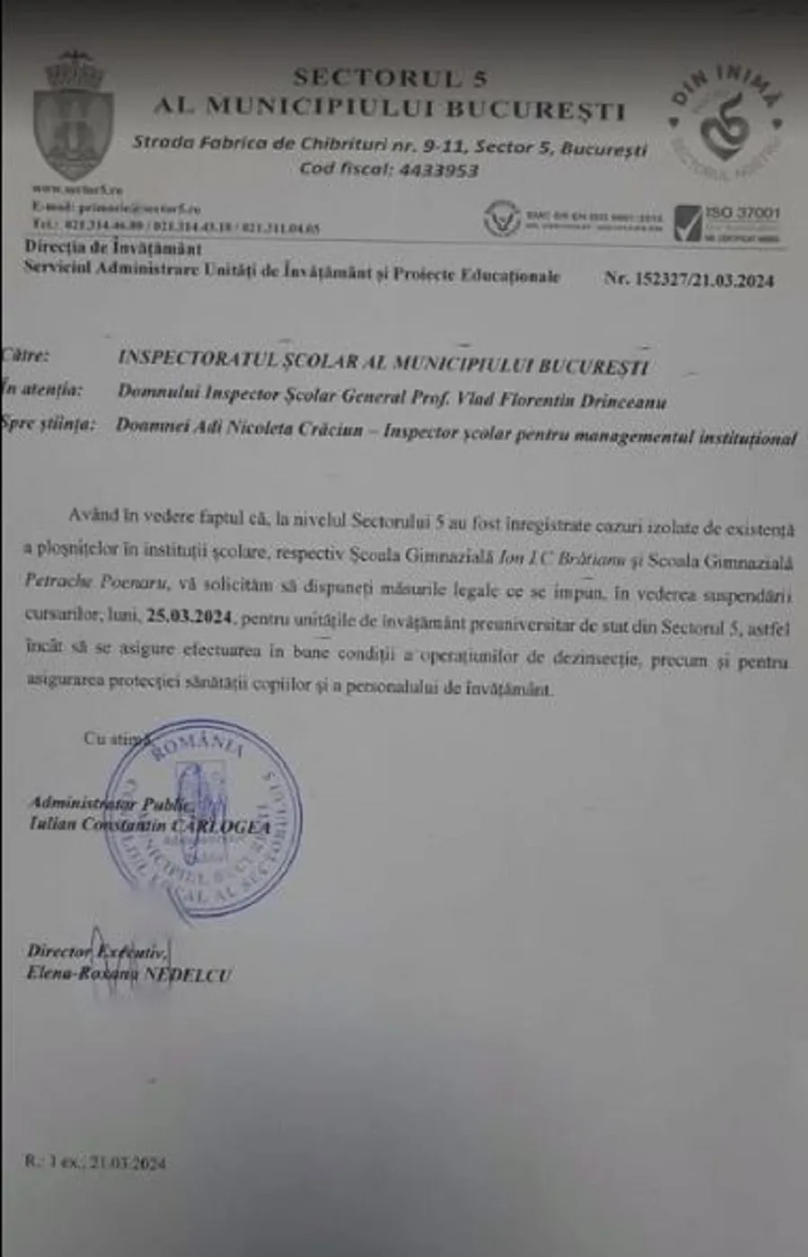 Astfel, pentru asigurarea protecției sănătății copiilor și a cadrelor didactice, primarul Sectorului 5, Cristian Popescu Piedone, a solicitat demararea tuturor demersurilor necesare pentru suspendarea cursurilor în instituțiile de învățământ din sector începând de vineri, 22 martie 2024 (după finalizarea cursurilor) până luni, 25 martie, pentru dezinsecția în școli și în perimetrul acestora împotriva ploșnițelor. Hotărârea edilului a primit acordul ministrului Educației, Ligia Deca. În cadrul unui comunicat, primarul Sectorului 5 a declarat că va verifica și cauza apariției ploșnițelor în unitățile de învățământ.