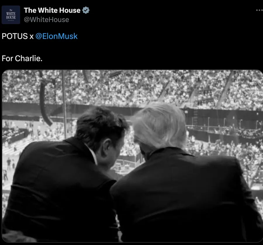 Trump a continuat spunând: „Hai să găsim o soluție pentru a reveni la normal”. În acel moment Elon Musk a dat din cap. Liderul american i-a strâns mâna și i-a spune: „Mi-ai lipsit”. Între timp, Elon Musk a postat pe platforma X, o fotografie cu el și Donald Trump stând împreună, cu descrierea „Pentru Charlie”. Această imagine a fost distribuită și de contul oficial al Casei Albe.