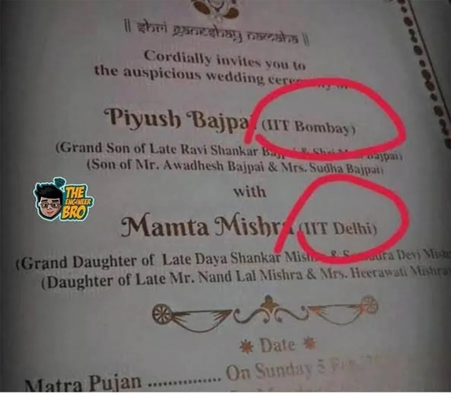 Piyush Bajpai și Mamta Mishra au ales să-și imprime pe invitațiile de nuntă și calificările academice. Tinerii indieni nu și-au dat seama că gestul va fi privit ca o aroganță de către invitați. Dat fiind faptul că și-au trecut rudele, de la bunici la părinți, poate că au vrut doar să se mândrească pentru că au absolvit universități cunoscute.