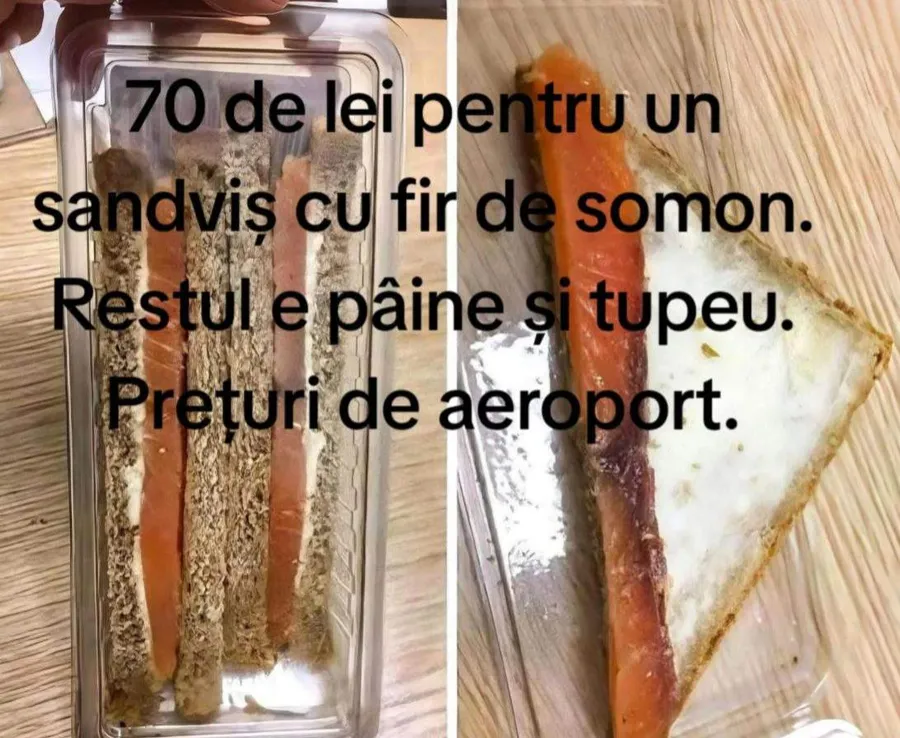 „70 de lei pentru un sandwich cu fir de somon. Restul e pâine și tupeu. Prețuri de aeroport“, a scris acesta, pe TikTok.