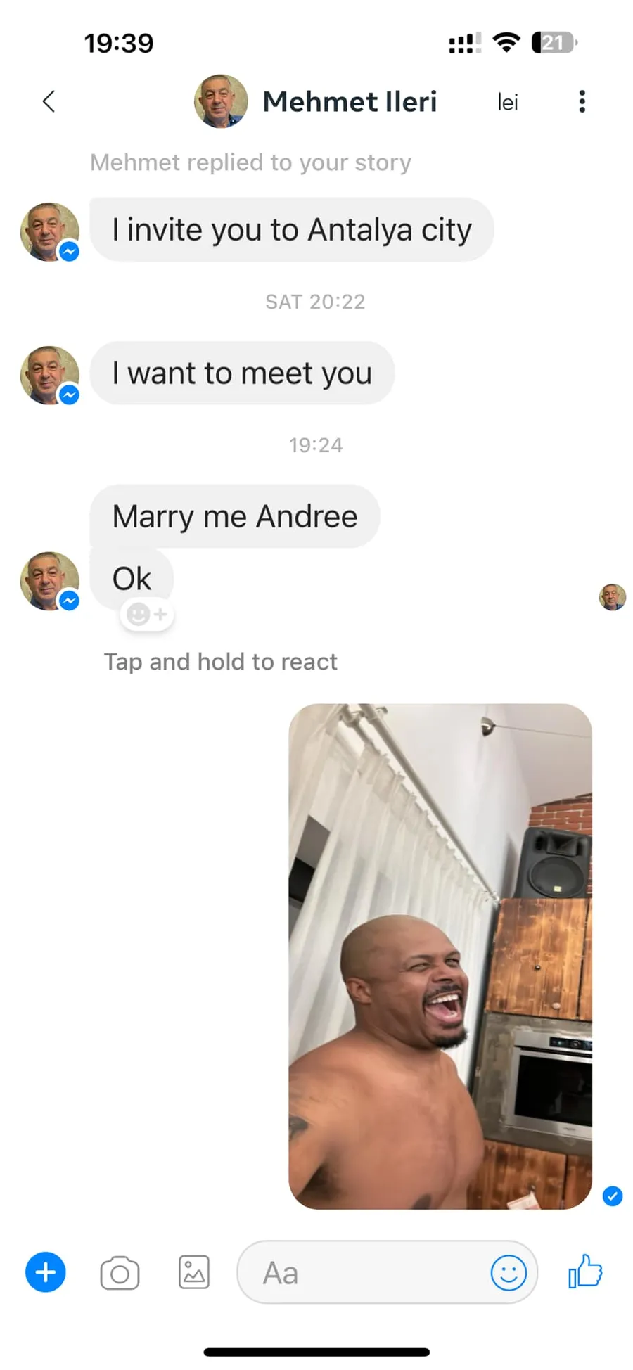 Mai exact, Andreea Ibacka s-a trezit că turcul a început să îi scrie și chiar a plusat cerându-o imediat de soție. Blondina s-a amuzat copios de mesajele primite de la bărbat și i-a arătat și soțului ei totul.