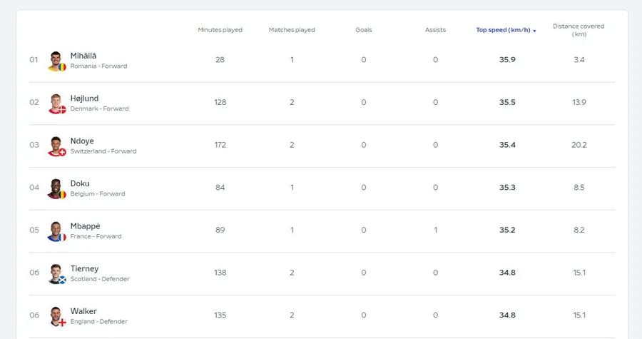 Valentin Mihăilă este urmat de Rasmus Hojlund, atacantul jucând 128 de minute. A atins o viteză de 35,5 km/h și a luat parte la două meciuri. Cel de-al treilea loc este ocupat de atacantul Dan Ndoye, care a atins o viteză de 35,4 km/h. A luat parte la două meciuri, jucând 172 de minute. Iată cum arată clasamentul prezentat de UEFA.