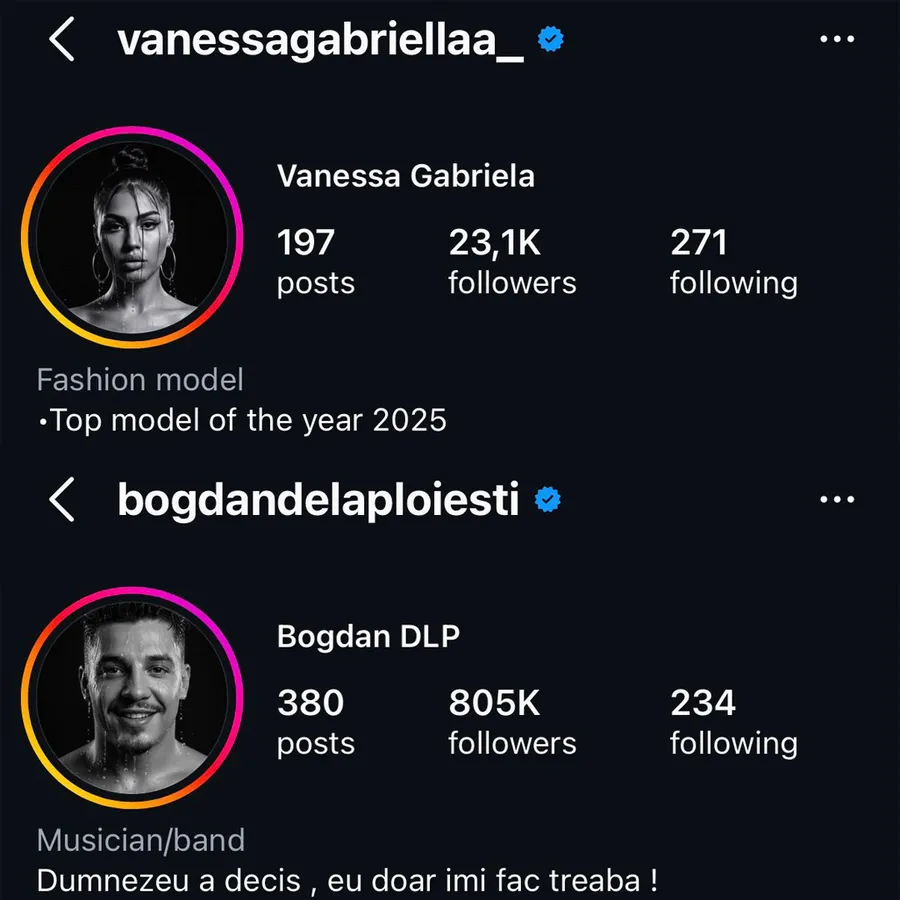 De exemplu, noile lor poze de profil de pe Instagram, care seamănă enorm între ele, și care sunt făcute cu același efect, în stil alb-negru, cu picături de apă care se preling peste fețele lor, nu înseamnă absolut nimic. De altfel, pozele nu sunt identice, pentru că într-una e Bogdan și în cealaltă Vanessa. 😂
