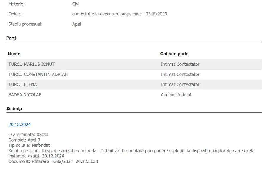 În ciuda tragediei și a legăturii strânse dintre cei doi, Nicolae Badea nu a stat pe gânduri și i-a dat în judecată pe urmașii lui Vasile Turcu pentru a-și recupera banii. Soția văduvă și cei doi fii ai lui Vasile Turcu au fost chemați în fața judecătorilor, iar verdictul final al instanței, pronunțat la sfârșitul lunii decembrie, a fost categoric: executarea familiei Turcu! Deși au încercat să anuleze decizia inițială, Tribunalul București a respins cererea lor, iar sentința a fost definitivă.