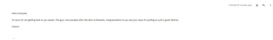 “Îmi pare rău că am întărziat cu acest răspuns. Băieții au fost super entuziasmați după show-ul din România. Felicitări vouă și echipei pentru organizarea unui asemenea festival excepțional.”