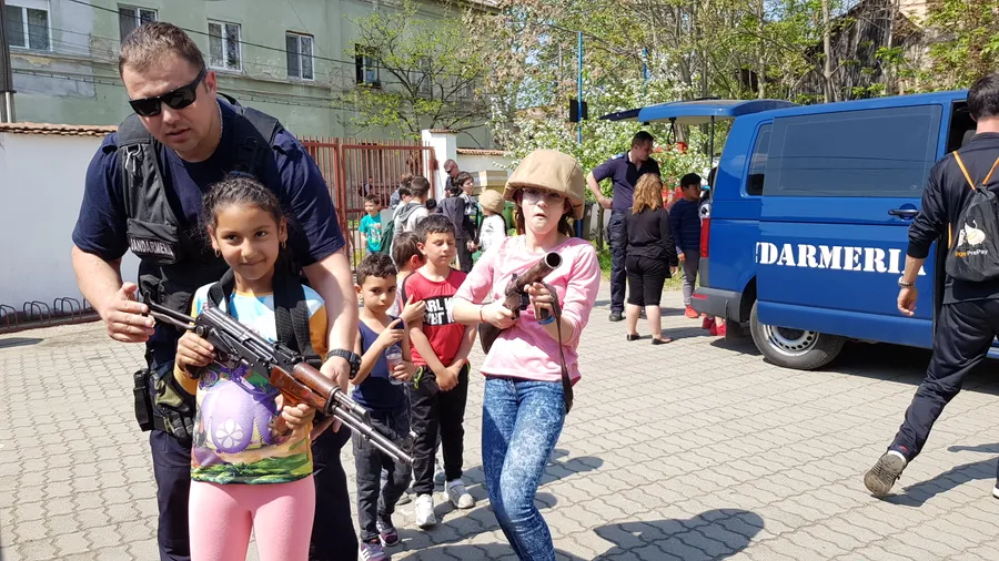 VIDEO. Zeci de copii din Arad au fost lăsați să se joace cu arme adevărate, apoi au fost băgați în dubele Jandarmeriei