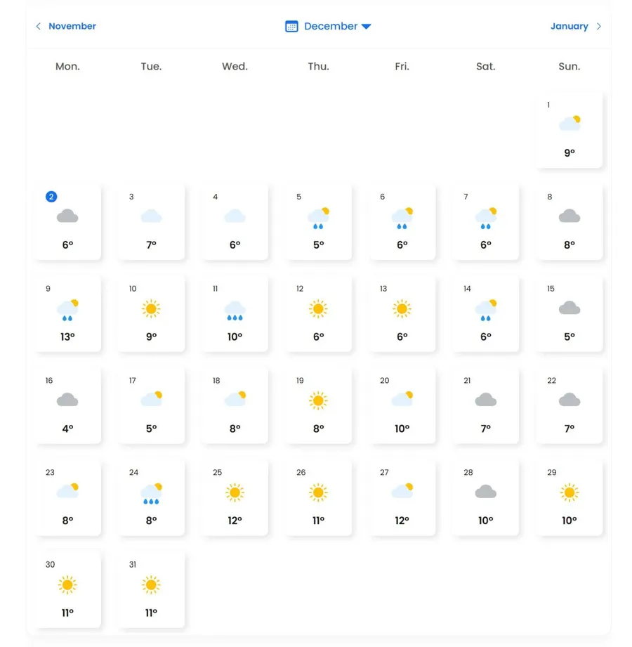Meteorologii EaseWheather au realizat prognoza meteo pe fiecare zi din luna decembrie. În mare parte, cerul va fi însorit, însă temperaturile nu vor fi mai mari de 13 grade Celsius. Ploile își vor face apariția în majoritatea zilelor din decembrie, însă pe 31 soarele va ieși din nori.