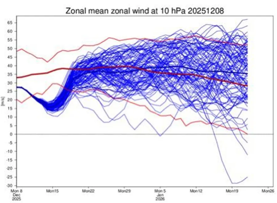 Meteorologii mai spun și că slăbirea rapidă a vortexului polar va dura până la mijlocul lunii decembrie 2025, iar până în jurul datei de 12 decembrie, va fi resimțită o încălzire stratosferică asupra Siberiei care va influența deformarea vortexului polar.