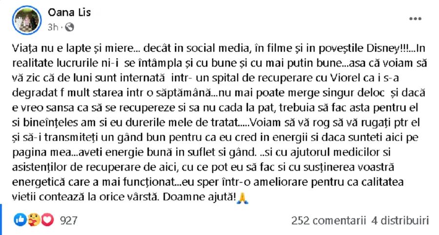 „Viața nu e lapte și miere… decât în social media, în filme și in poveștile Disney!!! În realitate, lucrurile ni se întâmplă și cu bune și cu mai putin bune… așa că voiam să vă zic că de luni sunt internată într-un spital de recuperare cu Viorel, că i s-a degradat foarte mult starea într-o săptămână.