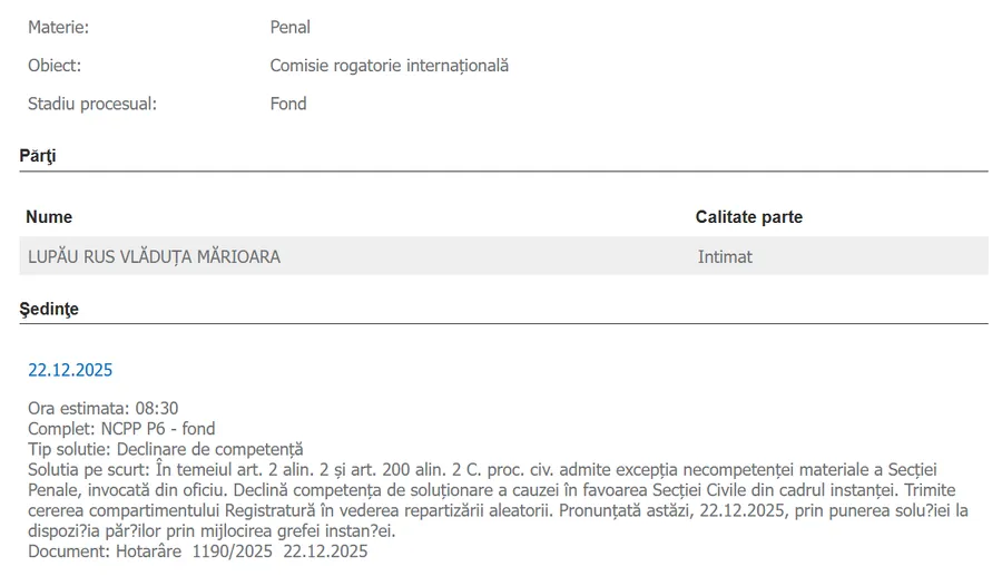 Prin urmare, instanța a decis declinarea competenței, iar dosarul va fi trimis către Secția Civilă a aceleiași instanțe, care va analiza dacă și în ce condiții pot fi comunicate documentele solicitate de statul sârb.