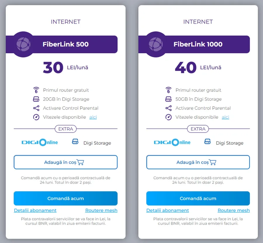 Una dintre oferte costă doar 30 de lei pe lună, iar contractul se întinde pe doi ani. În acest caz, viteza este de 500 Mbps. Pe lângă internetul prin fibră optică, compania mai oferă în acest preț primul router gratuit, 20 GB în Digi Storage, dar și activarea Controlului Parental.