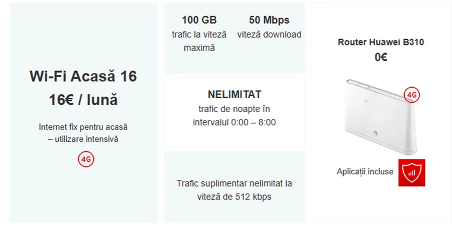 De cealaltă parte, Vodafone pune la dispoziția clienților un pachet mult mai scump, chiar dublu față de cei de la Digi RCS-RDS. Compania are disponibilă o ofertă cu 16 euro, adică 80 de lei, cu un trafic la viteză maximă de 100 GB, iar viteza de descărcare este de 50 Mbps. Totuși, trebuie precizat că modemul este gratuit doar în cazul contactelor încheiate pe 2 ani.