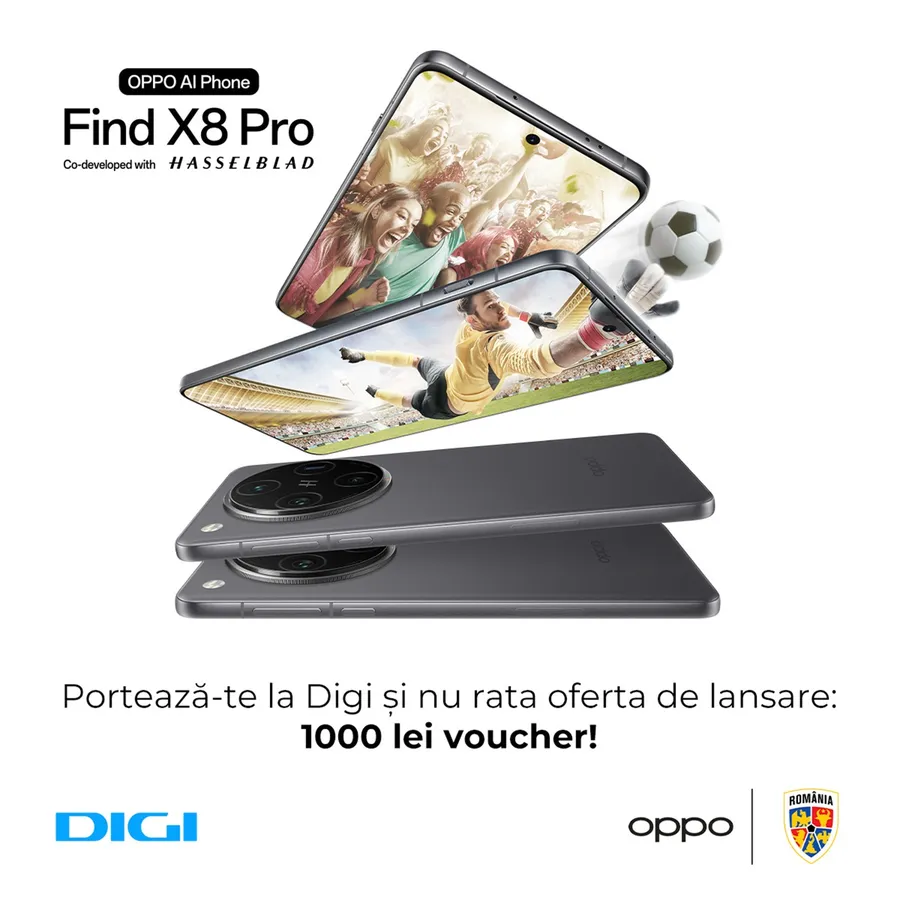 Mai exact, cei care își portează numărul de telefon la Digi se bucură și de o reducere de 1.000 de lei la achiziționarea noului OPPO Find X8 Pro. Abonații pot obține acest telefon cu o reducere și mai mare în funcție de tipul de abonament pentru care optează.