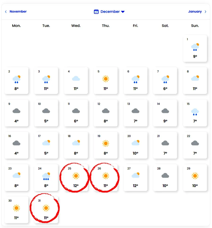 Meteorologilor EaseWeather au emis prognoza meteo pentru luna decembrie și anunță temperaturi mult peste normalul perioadei în preajma Sărbătorilor. De exemplu, de Crăciun, bucureștenii se vor bucura de o vreme frumoasă, fără ploi sau ninsori, iar termometrele vor indica 12 grade Celsius. De asemenea, și de Revelion, vremea rămâne una blândă, cu temperaturi de 11 grade Celsius.